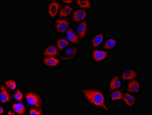 Immunofluorescent analysis of A549 cells using CSB-PA008856LA01HU at dilution of 1:100 and Cy3-congugated Goat Anti-Rabbit IgG