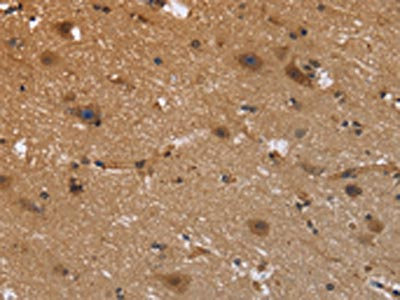 The image is immunohistochemistry of paraffin-embedded Human brain tissue using CSB-PA215571(FRK Antibody) at dilution 1/40. (Original magnification: ×200)