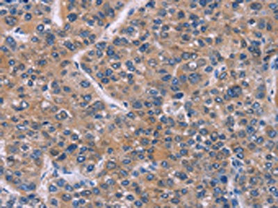 The image on the left is immunohistochemistry of paraffin-embedded Human liver cancer tissue using CSB-PA053903(FST Antibody) at dilution 1/20, on the right is treated with synthetic peptide. (Original magnification: ×200)
