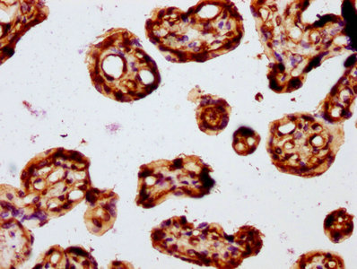 IHC image of CSB-PA882067ESR1HU diluted at 1:194 and staining in paraffin-embedded human placenta tissue performed on a Leica BondTM system. After dewaxing and hydration, antigen retrieval was mediated by high pressure in a citrate buffer (pH 6.0). Section was blocked with 10% normal goat serum 30min at RT. Then primary antibody (1% BSA) was incubated at 4°C overnight. The primary is detected by a biotinylated secondary antibody and visualized using an HRP conjugated SP system.