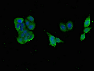 Immunofluorescent analysis of PC-3 cells using CSB-PA861986LA01HU at dilution of 1:100 and Alexa Fluor 488-congugated AffiniPure Goat Anti-Rabbit IgG(H+L)