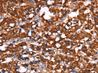 The image on the left is immunohistochemistry of paraffin-embedded Human thyroid cancer tissue using CSB-PA950411(GAGE12I Antibody) at dilution 1/30, on the right is treated with synthetic peptide. (Original magnification: ×200)