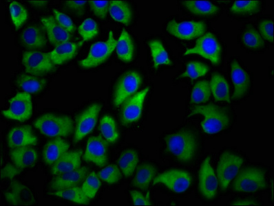 Immunofluorescence staining of A549 cells with CSB-PA009224LA01HU at 1:133, counter-stained with DAPI. The cells were fixed in 4% formaldehyde, permeabilized using 0.2% Triton X-100 and blocked in 10% normal Goat Serum. The cells were then incubated with the antibody overnight at 4°C. The secondary antibody was Alexa Fluor 488-congugated AffiniPure Goat Anti-Rabbit IgG(H+L).