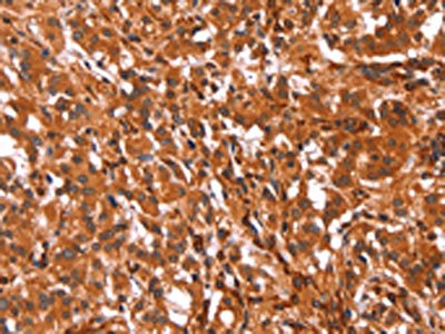 The image on the left is immunohistochemistry of paraffin-embedded Human thyroid cancer tissue using CSB-PA934012(GCG Antibody) at dilution 1/20, on the right is treated with synthetic peptide. (Original magnification: ×200)