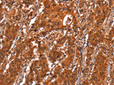 The image on the left is immunohistochemistry of paraffin-embedded Human gastic cancer tissue using CSB-PA934012(GCG Antibody) at dilution 1/20, on the right is treated with synthetic peptide. (Original magnification: ×200)