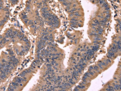 The image on the left is immunohistochemistry of paraffin-embedded Human colon cancer tissue using CSB-PA135172(GCG Antibody) at dilution 1/20, on the right is treated with synthetic peptide. (Original magnification: ×200)