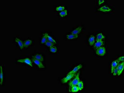 Immunofluorescent analysis of HepG2 cells using CSB-PA009316LA01HU at dilution of 1:100 and Alexa Fluor 488-congugated AffiniPure Goat Anti-Rabbit IgG(H+L)