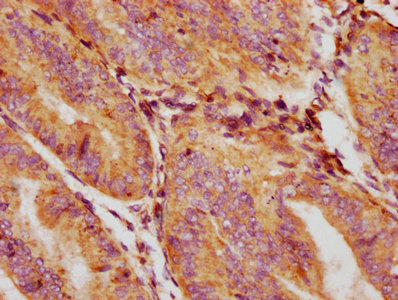 IHC image of CSB-PA009349ESR1HU diluted at 1:132 and staining in paraffin-embedded human endometrial cancer performed on a Leica BondTM system. After dewaxing and hydration, antigen retrieval was mediated by high pressure in a citrate buffer (pH 6.0). Section was blocked with 10% normal goat serum 30min at RT. Then primary antibody (1% BSA) was incubated at 4°C overnight. The primary is detected by a biotinylated secondary antibody and visualized using an HRP conjugated SP system.