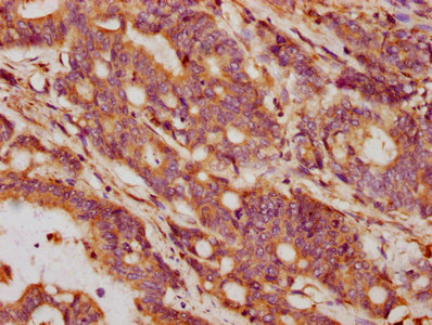 IHC image of CSB-PA009349ESR1HU diluted at 1:132 and staining in paraffin-embedded human colon cancer performed on a Leica BondTM system. After dewaxing and hydration, antigen retrieval was mediated by high pressure in a citrate buffer (pH 6.0). Section was blocked with 10% normal goat serum 30min at RT. Then primary antibody (1% BSA) was incubated at 4°C overnight. The primary is detected by a biotinylated secondary antibody and visualized using an HRP conjugated SP system.