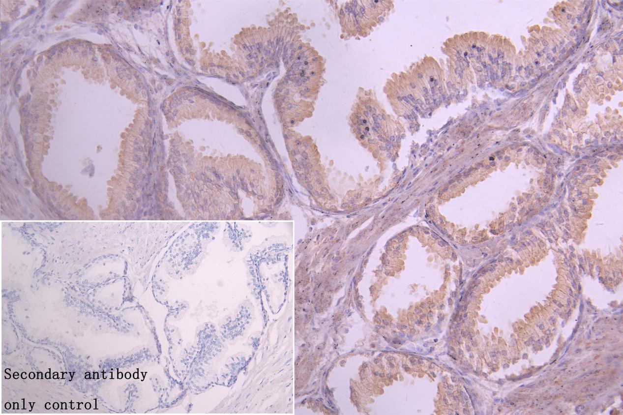 IHC image of CSB-PA822219LA01HU diluted at 1:20 and staining in paraffin-embedded human prostate cancer performed on a Leica BondTM system. After dewaxing and hydration, antigen retrieval was mediated by high pressure in a citrate buffer (pH 6.0). Section was blocked with 10% normal goat serum 30min at RT. Then primary antibody (1% BSA) was incubated at 4°C overnight. The primary is detected by a Goat anti-rabbit polymer IgG labeled by HRP and visualized using 0.05% DAB. Secondary antibody only control: uses 1% BSA instead of primary antibody