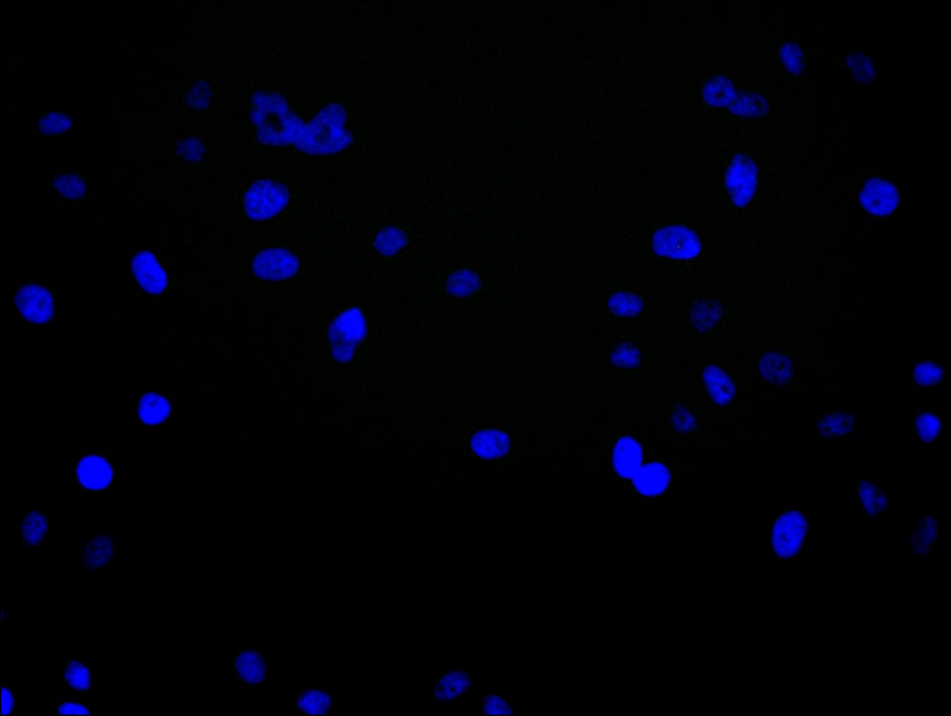 Immunofluorescence staining of Hela cell with 5% goat serum, counter-stained with DAPI. The cells were fixed in 4% formaldehyde and blocked in 10% normal Goat Serum. The cells were then incubated with the antibody overnight at 4C. The secondary antibody was Alexa Fluor 488-congugated AffiniPure Goat Anti-Rabbit IgG(H+L).