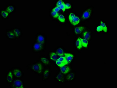 Immunofluorescence staining of Hela cells with CSB-PA891536LA01HU at 1:166, counter-stained with DAPI. The cells were fixed in 4% formaldehyde, permeabilized using 0.2% Triton X-100 and blocked in 10% normal Goat Serum. The cells were then incubated with the antibody overnight at 4°C. The secondary antibody was Alexa Fluor 488-congugated AffiniPure Goat Anti-Rabbit IgG(H+L).