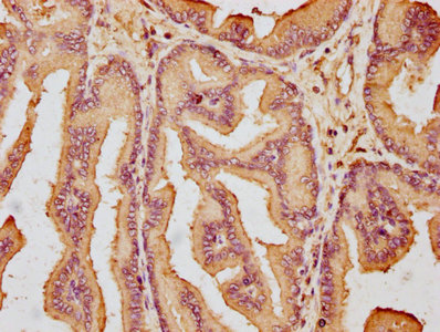 IHC image of CSB-PA880974LA01HU diluted at 1:600 and staining in paraffin-embedded human prostate tissue performed on a Leica BondTM system. After dewaxing and hydration, antigen retrieval was mediated by high pressure in a citrate buffer (pH 6.0). Section was blocked with 10% normal goat serum 30min at RT. Then primary antibody (1% BSA) was incubated at 4°C overnight. The primary is detected by a biotinylated secondary antibody and visualized using an HRP conjugated SP system.