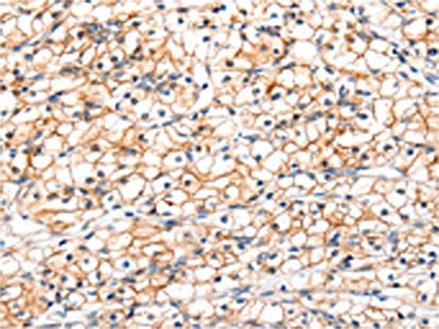 The image on the left is immunohistochemistry of paraffin-embedded Human renal cancer tissue using CSB-PA183226(GLP1R Antibody) at dilution 1/20, on the right is treated with fusion protein. (Original magnification: ×200)
