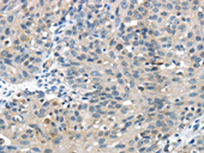 The image on the left is immunohistochemistry of paraffin-embedded Human prostate cancer tissue using CSB-PA025580(GLP2R Antibody) at dilution 1/30, on the right is treated with fusion protein. (Original magnification: ×200)