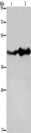 Gel: 8%SDS-PAGE, Lysate: 40 μg, Lane 1-2: Mouse liver tissue, Mouse brain tissue, Primary antibody: CSB-PA676168(GLUL Antibody) at dilution 1/600, Secondary antibody: Goat anti rabbit IgG at 1/8000 dilution, Exposure time: 10 seconds