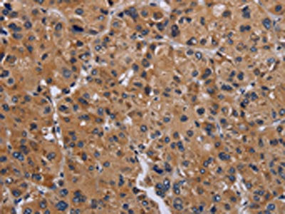 The image on the left is immunohistochemistry of paraffin-embedded Human liver cancer tissue using CSB-PA247539(GNAS Antibody) at dilution 1/30, on the right is treated with fusion protein. (Original magnification: ×200)