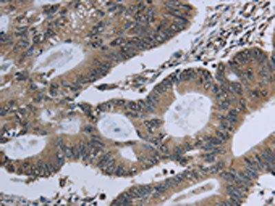 The image on the left is immunohistochemistry of paraffin-embedded Human colon cancer tissue using CSB-PA234599(GNG2 Antibody) at dilution 1/60, on the right is treated with fusion protein. (Original magnification: ×200)