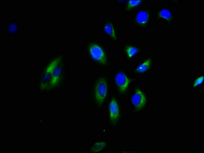 Immunofluorescence staining of A549 cells with CSB-PA009622LA01HU at 1:200, counter-stained with DAPI. The cells were fixed in 4% formaldehyde, permeabilized using 0.2% Triton X-100 and blocked in 10% normal Goat Serum. The cells were then incubated with the antibody overnight at 4°C. The secondary antibody was Alexa Fluor 488-congugated AffiniPure Goat Anti-Rabbit IgG(H+L).