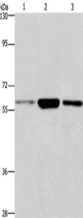 Gel: 6%SDS-PAGE, Lysate: 40 μg, Lane 1-3: K562 cells, 231 cells, human fetal liver tissue, Primary antibody: CSB-PA929652(GPC6 Antibody) at dilution 1/750, Secondary antibody: Goat anti rabbit IgG at 1/8000 dilution, Exposure time: 1 minute