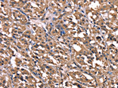 The image on the left is immunohistochemistry of paraffin-embedded Human thyroid cancer tissue using CSB-PA548371(GPR65 Antibody) at dilution 1/20, on the right is treated with synthetic peptide. (Original magnification: ×200)