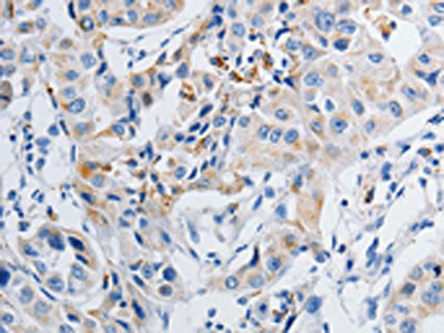 The image on the left is immunohistochemistry of paraffin-embedded Human lung cancer tissue using CSB-PA100222(GRIA3 Antibody) at dilution 1/50, on the right is treated with synthetic peptide. (Original magnification: ×200)