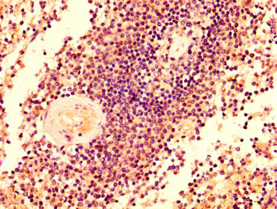 IHC image of CSB-PA00969A0Rb diluted at 1:500 and staining in paraffin-embedded human spleen tissue performed on a Leica BondTM system. After dewaxing and hydration, antigen retrieval was mediated by high pressure in a citrate buffer (pH 6.0). Section was blocked with 10% normal goat serum 30min at RT. Then primary antibody (1% BSA) was incubated at 4°C overnight. The primary is detected by a biotinylated secondary antibody and visualized using an HRP conjugated SP system.