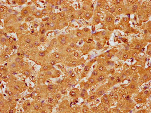 IHC image of CSB-PA010087OA107nme1HU diluted at 1:10 and staining in paraffin-embedded human liver tissue performed on a Leica BondTM system. After dewaxing and hydration, antigen retrieval was mediated by high pressure in a citrate buffer (pH 6.0). Section was blocked with 10% normal goat serum 30min at RT. Then primary antibody (1% BSA) was incubated at 4°C overnight. The primary is detected by a biotinylated secondary antibody and visualized using an HRP conjugated SP system.
