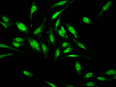 Immunofluorescence staining of Hela cells with CSB-PA17869A0Rb at 1:133, counter-stained with DAPI. The cells were fixed in 4% formaldehyde, permeabilized using 0.2% Triton X-100 and blocked in 10% normal Goat Serum. The cells were then incubated with the antibody overnight at 4°C. The secondary antibody was Alexa Fluor 488-congugated AffiniPure Goat Anti-Rabbit IgG(H+L).