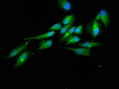 Immunofluorescence staining of Hela cells with CSB-PA732977LA01HU at 1:100, counter-stained with DAPI. The cells were fixed in 4% formaldehyde, permeabilized using 0.2% Triton X-100 and blocked in 10% normal Goat Serum. The cells were then incubated with the antibody overnight at 4°C. The secondary antibody was Alexa Fluor 488-congugated AffiniPure Goat Anti-Rabbit IgG(H+L).