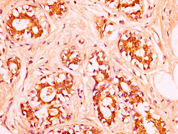 IHC image of CSB-PA010378OA62nsucHU diluted at 1:50 and staining in paraffin-embedded human breast cancer performed on a Leica BondTM system. After dewaxing and hydration, antigen retrieval was mediated by high pressure in a citrate buffer (pH 6.0). Section was blocked with 10% normal goat serum 30min at RT. Then primary antibody (1% BSA) was incubated at 4°C overnight. The primary is detected by a biotinylated secondary antibody and visualized using an HRP conjugated SP system.