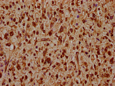 IHC image of CSB-PA010378OA74nhibHU diluted at 1:20 and staining in paraffin-embedded human glioma performed on a Leica BondTM system. After dewaxing and hydration, antigen retrieval was mediated by high pressure in a citrate buffer (pH 6.0). Section was blocked with 10% normal goat serum 30min at RT. Then primary antibody (1% BSA) was incubated at 4°C overnight. The primary is detected by a biotinylated secondary antibody and visualized using an HRP conjugated SP system.