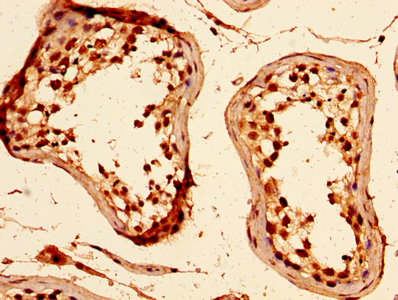 IHC image of CSB-PA010378OA89nacHU diluted at 1:50 and staining in paraffin-embedded human testis tissue performed on a Leica BondTM system. After dewaxing and hydration, antigen retrieval was mediated by high pressure in a citrate buffer (pH 6.0). Section was blocked with 10% normal goat serum 30min at RT. Then primary antibody (1% BSA) was incubated at 4°C overnight. The primary is detected by a biotinylated secondary antibody and visualized using an HRP conjugated SP system.