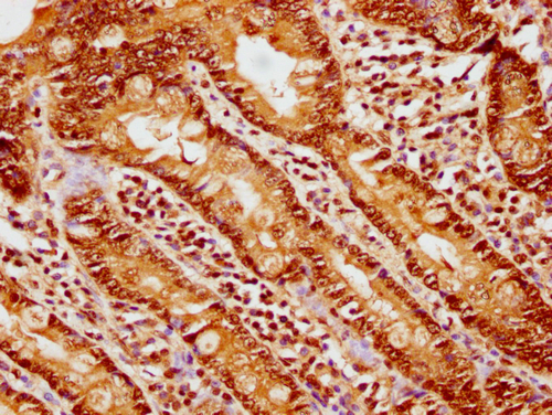 IHC image of CSB-PA010378OA33ncrHU diluted at 1:10 and staining in paraffin-embedded human small intestine tissue performed on a Leica BondTM system. After dewaxing and hydration, antigen retrieval was mediated by high pressure in a citrate buffer (pH 6.0). Section was blocked with 10% normal goat serum 30min at RT. Then primary antibody (1% BSA) was incubated at 4°C overnight. The primary is detected by a biotinylated secondary antibody and visualized using an HRP conjugated SP system.