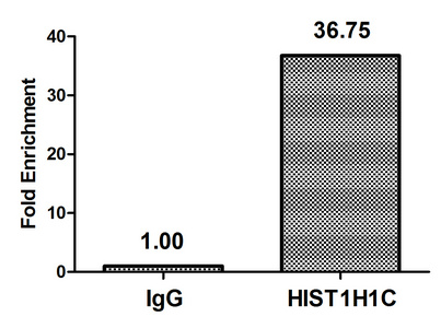 Chromatin Immunoprecipitation Hela (4*106) were treated with Micrococcal Nuclease, sonicated, and immunoprecipitated with 5µg anti-HIST1H1C (CSB-PA010378OA45nme2HU) or a control normal rabbit IgG. The resulting ChIP DNA was quantified using real-time PCR with primers against the β-Globin promoter.