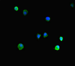 Immunofluorescent analysis of HepG2 cells using CSB-PA010378HA01HU at dilution of 1:100 and Alexa Fluor 488-congugated AffiniPure Goat Anti-Rabbit IgG(H+L)