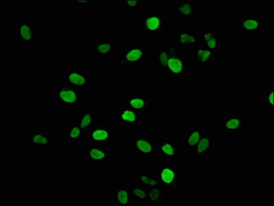 Immunofluorescence staining of Hela cells with CSB-PA010380OA17nphHU at 1:2.5, counter-stained with DAPI. The cells were fixed in 4% formaldehyde, permeabilized using 0.2% Triton X-100 and blocked in 10% normal Goat Serum. The cells were then incubated with the antibody overnight at 4°C. The secondary antibody was Alexa Fluor 488-congugated AffiniPure Goat Anti-Rabbit IgG(H+L).