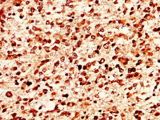 IHC image of CSB-PA010380OA17nphHU diluted at 1:50 and staining in paraffin-embedded human glioma performed on a Leica BondTM system. After dewaxing and hydration, antigen retrieval was mediated by high pressure in a citrate buffer (pH 6.0). Section was blocked with 10% normal goat serum 30min at RT. Then primary antibody (1% BSA) was incubated at 4°C overnight. The primary is detected by a biotinylated secondary antibody and visualized using an HRP conjugated SP system.