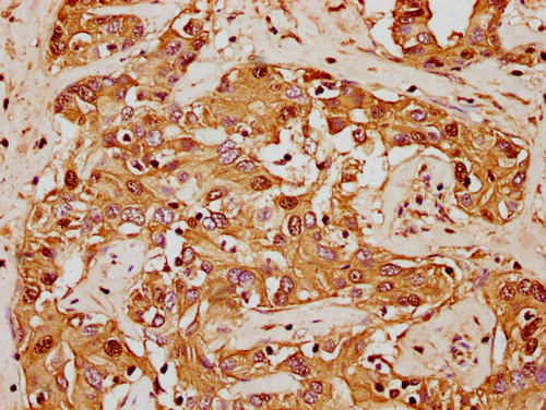 IHC image of CSB-PA010380OA62nforHU diluted at 1:20 and staining in paraffin-embedded human liver cancer performed on a Leica BondTM system. After dewaxing and hydration, antigen retrieval was mediated by high pressure in a citrate buffer (pH 6.0). Section was blocked with 10% normal goat serum 30min at RT. Then primary antibody (1% BSA) was incubated at 4°C overnight. The primary is detected by a biotinylated secondary antibody and visualized using an HRP conjugated SP system.