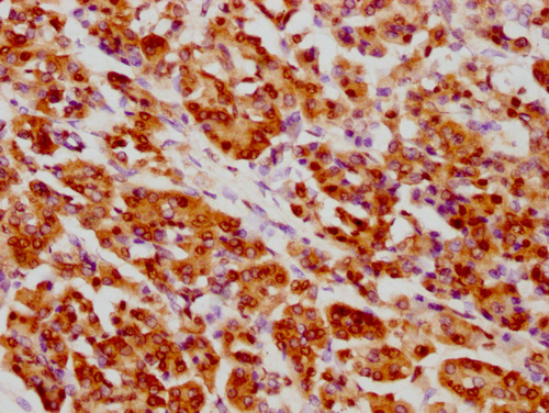 IHC image of CSB-PA010389PA09nacHU diluted at 1:10 and staining in paraffin-embedded human glioma cancer performed on a Leica BondTM system. After dewaxing and hydration, antigen retrieval was mediated by high pressure in a citrate buffer (pH 6.0). Section was blocked with 10% normal goat serum 30min at RT. Then primary antibody (1% BSA) was incubated at 4°C overnight. The primary is detected by a biotinylated secondary antibody and visualized using an HRP conjugated SP system.