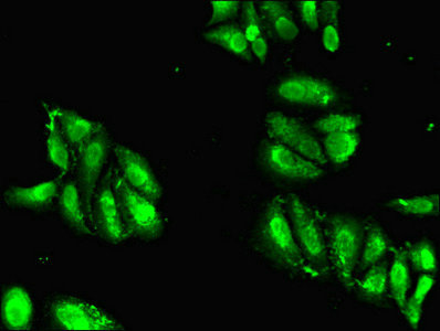 Immunofluorescent analysis of Hela cells using CSB-PA010389LA01HU at dilution of 1:100 and Alexa Fluor 488-congugated AffiniPure Goat Anti-Rabbit IgG(H+L)