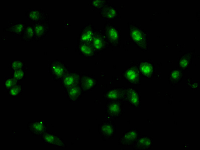 Immunofluorescence staining of Hela cells with CSB-PA010403OA20nhibHU at 1:1, counter-stained with DAPI. The cells were fixed in 4% formaldehyde, permeabilized using 0.2% Triton X-100 and blocked in 10% normal Goat Serum. The cells were then incubated with the antibody overnight at 4°C. The secondary antibody was Alexa Fluor 488-congugated AffiniPure Goat Anti-Rabbit IgG(H+L).