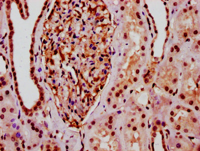 IHC image of CSB-PA010403OA20nhibHU diluted at 1:10 and staining in paraffin-embedded human kidney tissue performed on a Leica BondTM system. After dewaxing and hydration, antigen retrieval was mediated by high pressure in a citrate buffer (pH 6.0). Section was blocked with 10% normal goat serum 30min at RT. Then primary antibody (1% BSA) was incubated at 4°C overnight. The primary is detected by a biotinylated secondary antibody and visualized using an HRP conjugated SP system.