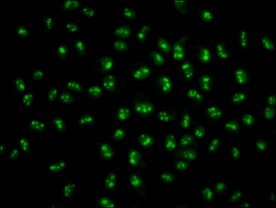 Immunofluorescence staining of Hela cells with CSB-PA010403OA05ncrHU at 1:1, counter-stained with DAPI. The cells were fixed in 4% formaldehyde, permeabilized using 0.2% Triton X-100 and blocked in 10% normal Goat Serum. The cells were then incubated with the antibody overnight at 4°C. The secondary antibody was Alexa Fluor 488-congugated AffiniPure Goat Anti-Rabbit IgG(H+L).