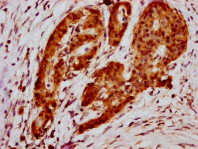 IHC image of CSB-PA010403OA05ncrHU diluted at 1:20 and staining in paraffin-embedded human pancreatic cancer performed on a Leica BondTM system. After dewaxing and hydration, antigen retrieval was mediated by high pressure in a citrate buffer (pH 6.0). Section was blocked with 10% normal goat serum 30min at RT. Then primary antibody (1% BSA) was incubated at 4°C overnight. The primary is detected by a biotinylated secondary antibody and visualized using an HRP conjugated SP system.