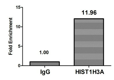 Chromatin Immunoprecipitation Hela (4*106) were treated with Micrococcal Nuclease, sonicated, and immunoprecipitated with 8µg anti-HIST1H3A (CSB-PA010418PA17nme1HU) or a control normal rabbit IgG. The resulting ChIP DNA was quantified using real-time PCR with primers against the β-Globin promoter.