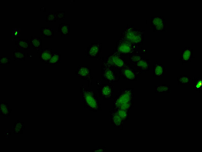 Immunofluorescent analysis of Hela cells using CSB-PA010418PA17nme1HU at dilution of 1:100 and Alexa Fluor 488-congugated AffiniPure Goat Anti-Rabbit IgG(H+L)