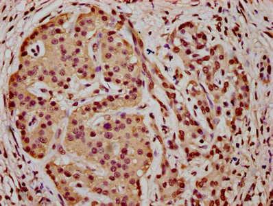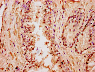 IHC image of CSB-PA010418OA18nbutHU diluted at 1:5 and staining in paraffin-embedded human prostate cancer performed on a Leica BondTM system. After dewaxing and hydration, antigen retrieval was mediated by high pressure in a citrate buffer (pH 6.0). Section was blocked with 10% normal goat serum 30min at RT. Then primary antibody (1% BSA) was incubated at 4°C overnight. The primary is detected by a biotinylated secondary antibody and visualized using an HRP conjugated SP system.