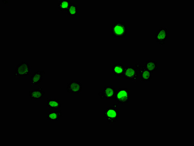 Immunofluorescence staining of MCF-7 cells with CSB-PA010418OA18nbutHU at 1:2.5, counter-stained with DAPI. The cells were fixed in 4% formaldehyde, permeabilized using 0.2% Triton X-100 and blocked in 10% normal Goat Serum. The cells were then incubated with the antibody overnight at 4°C. The secondary antibody was Alexa Fluor 488-congugated AffiniPure Goat Anti-Rabbit IgG(H+L).