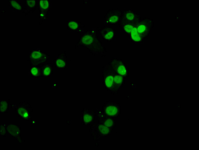 Immunofluorescence staining of MCF-7 cells with CSB-PA010418OA23nsucHU at 1:4, counter-stained with DAPI. The cells were fixed in 4% formaldehyde, permeabilized using 0.2% Triton X-100 and blocked in 10% normal Goat Serum. The cells were then incubated with the antibody overnight at 4°C. The secondary antibody was Alexa Fluor 488-congugated AffiniPure Goat Anti-Rabbit IgG(H+L).